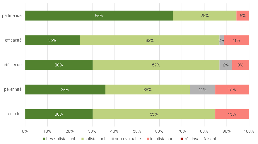- Le tableau général est très positif. L’évaluation globale est «très satisfaisante» ou «satisfaisante» pour 86% des projets. La pertinence des projets, c’est-à-dire la question de savoir s’ils visent juste, obtient un très bon score.